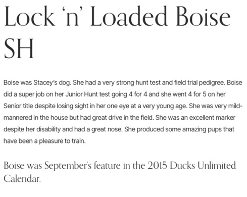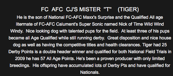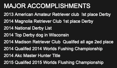Maggie is an incredible hunter. She’s that one in a million that can find that bird that has no scent, track it to the bird is forced to flush, where other dogs have pass over and never even flick a ear. She has hunted and retrieved thousands of birds. She was honored at the 13th annual NBDCA National Championships in March of 2008 for Amateur Dog of The Year. More recently Maggie was crowned the 2011 World Flushing Champion. She has a very diverse pedigree ranging from British Import Field Champion dogs to American & Canadian National and Amateur National Field Champions. Many of these dogs hold dual titles including AKC, BDC, HRC, APLA, and NAHRA.